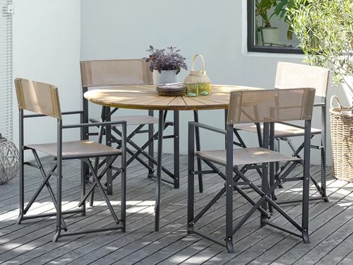 Bord: Stål och oljat FSC® hårdträ. Ø120 x H74 cm. Stol: Stål och textilene. Hopfällbar.