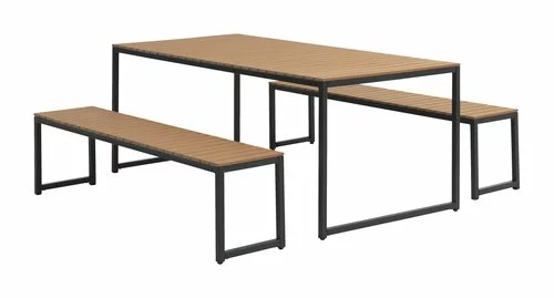 Bord: Aluminium, stål och konstträ. B90 x L190 x H74 cm. Bänk: Aluminium, stål och konstträ. B170 x H43 x D36 cm