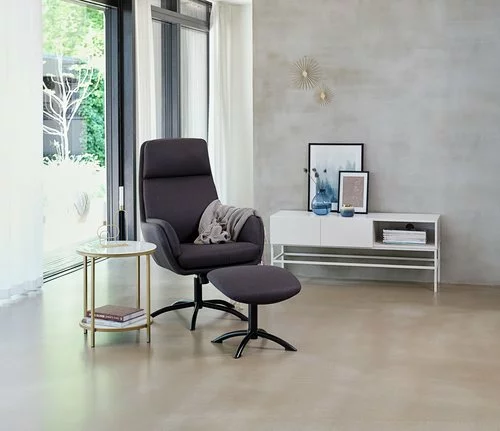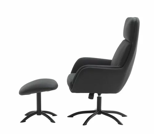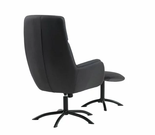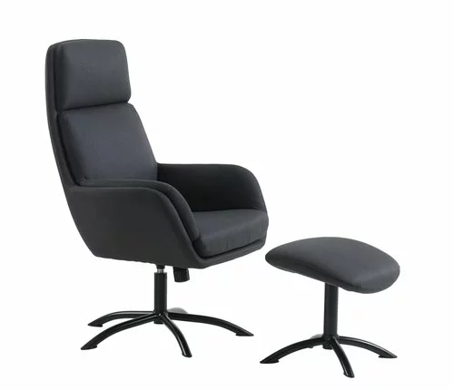 Tygklädsel. Sitt- och ryggdyna i skum. Med vridplatta i stål och steglös lutningsmekanism. Inkl. fotpall. B70 x H110 x D118 cm