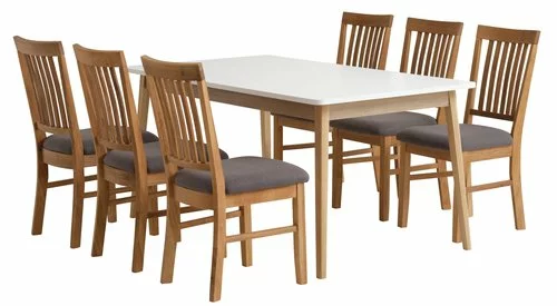 Massiv ek och konstfanér. Inkl. 1 klaff, som kan förvaras under bordsskivan. B90 x L160/200 x H75 cm. Stol: Tygklädsel och massiv ek.