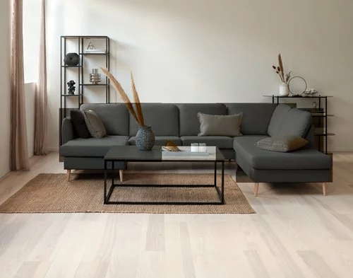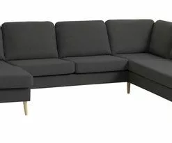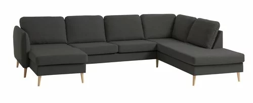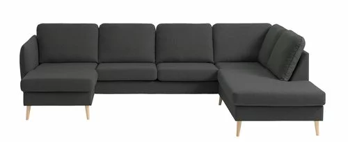6-sits hörnsoffa med tygklädsel. Sitt-och ryggdynor i skum. Ben i massiv bok. Kan ej spegelvändas. B294 x H82 x D84/137/201 cm