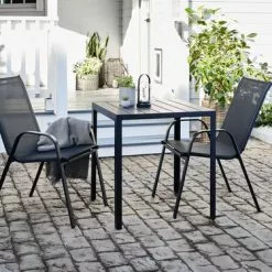 Bord: Aluminium och konstträ. B70 x L70 x H74 cm. Stol: Stål och textilene. Stapelbar.