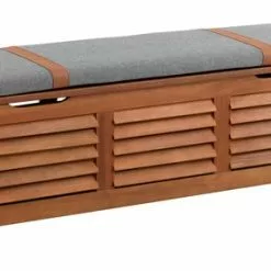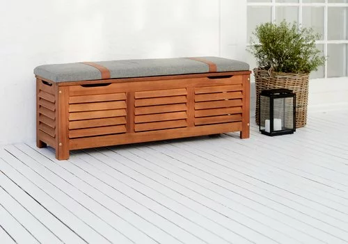 Oljat FSC® hårdträ. Med praktiskt hydrauliskt lock. Kan även användas som bänk. Frostsäker. Inkl. exklusiv dyna med slitstarkt, strukturvävt överdrag. B128 x H43 x D42 cm