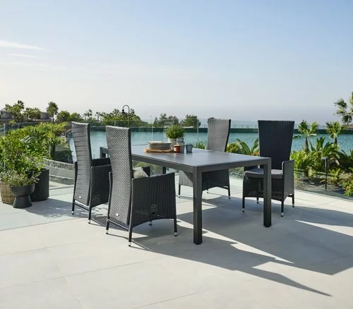 Bord: Aluminium och DURAWOOD® kompositträ, ett slitstarkt kompositmaterial som består av FSC® hårdträfiber och plast. B100 x L214 x H74 cm. Stol: Aluminium och konstrotting. Med steglös ryggjustering.
