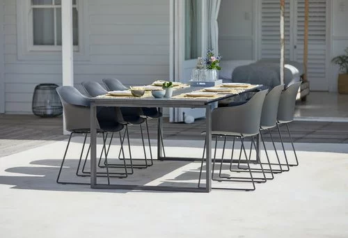 Bord: Aluminium och DURAWOOD® kompositträ, ett slitstarkt kompositmaterial som består av FSC® hårdträfiber och plast. B100 x L215 x H75 cm. Stol: Stål och formgjuten, UV-skyddad plast.