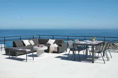 6-sits loungesoffa i aluminium. Dynor i snabbtorkande skum som inte absorberar fukt. Överdraget är vatten- och smutståligt och UV-skyddat, så att tyget inte bleks. Tål alla typer av väder. Kan ej spegelvändas. B230 x H71 x D260 cm
