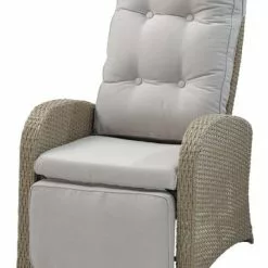 Aluminium och konstrotting. Steglös justering av stolsrygg och benstöd. Inkl. exklusiv dyna med slitstarkt, strukturvävt överdrag. B66 x H102 x D78 cm