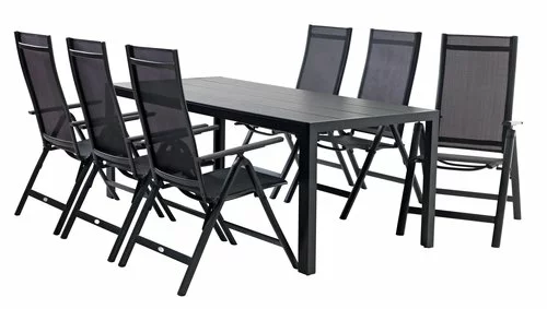 Bord: Aluminium och konstträ. B90 x L205 x H74 cm. Stol: Aluminium och textiline. 6 positioner. Hopfällbar.