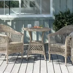 Bord: Aluminium, konstrotting och konstträ. Ø70 x H76 cm. Stol: Aluminium, galvaniserat stål och konstrotting. Stapelbar.