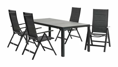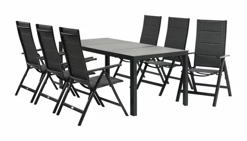 Bord: Aluminium och keramik. B90 x L195 x H74 cm. Stol: Aluminium, textiline och snabbtorkande skumstoppning. 6 positioner. Hopfällbar.