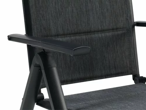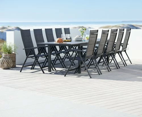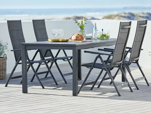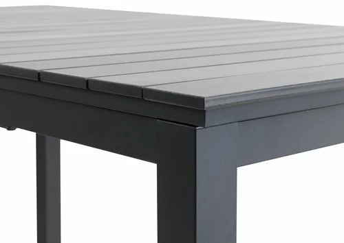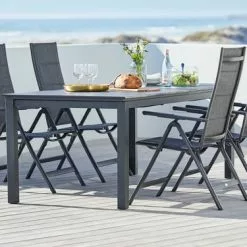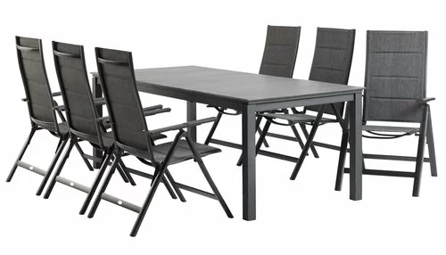Bord: Aluminium och DURAWOOD® kompositträ, ett slitstarkt kompositmaterial som består av FSC® hårdträfiber och plast. Inkl. 2 klaffar som kan förvaras under bordsskivan. B95 x L214/315 x H77 cm. Stol: Aluminium, textilene och snabbtorkande skumstoppning. 6 positioner. Hopfällbar.