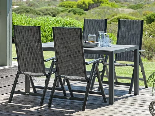 Bord: Aluminium och konstträ. B90 x L150 x H74 cm. Stol: Aluminium och konstrotting. 6 positioner. Hopfällbar.