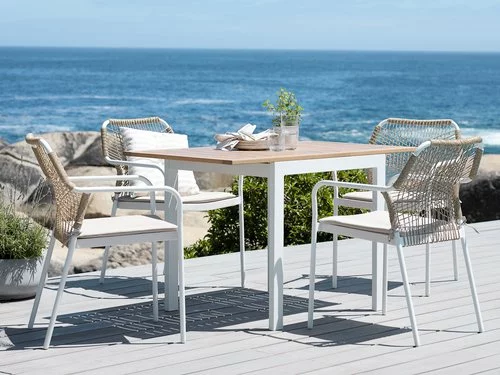 Bord: Aluminium och oljat FSC® hårdträ. Med 1 klaff. B70 x L75/126 x H75 cm. Stol: Aluminium, textilene och konstrotting. Inkl. kvalitetsdyna med slitstarkt överdrag. Stapelbar.