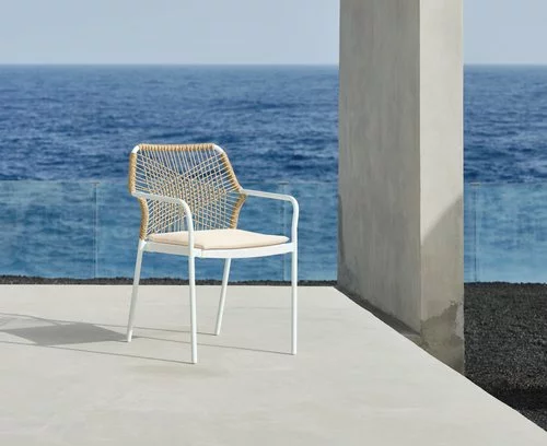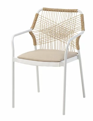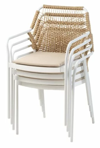 Aluminium, textilene och konstrotting. Inkl. kvalitetsdyna med slitstarkt överdrag. Stapelbar.