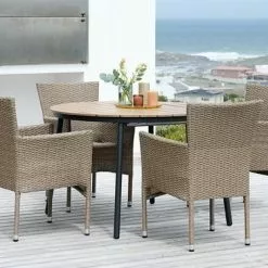 Bord: Aluminium, stål och konstträ. Inkl. 1 klaff. B120 x L120/170 x H75 cm. Stol: Stål och konstrotting. Stapelbar.