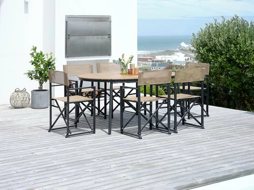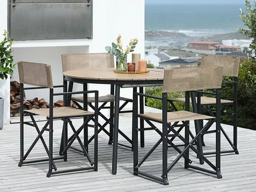 Bord: Aluminium, stål och konstträ. Inkl. 1 klaff. B120 x L120/170 x H75 cm. Stol: Stål och textilene. Hopfällbar.