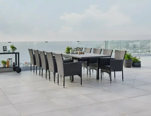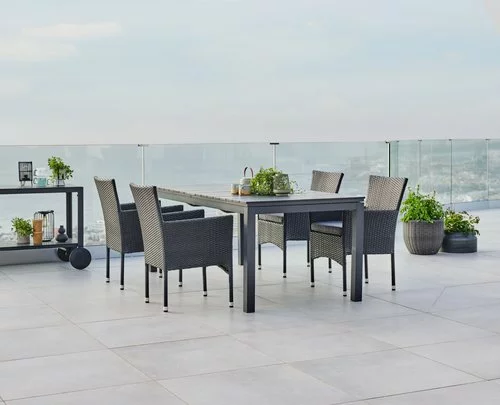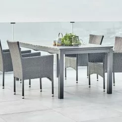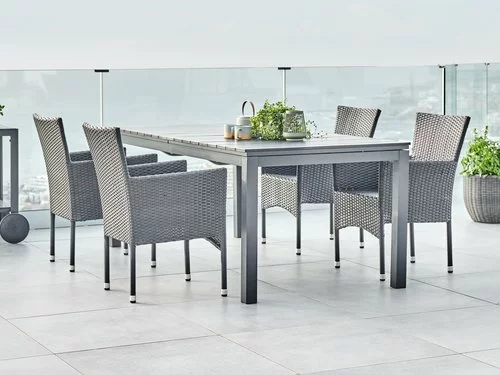 Bord: Aluminium och konstträ. Inkl. 2 klaffar, som kan förvaras under bordsskivan. B95 x L206/319 x H76 cm. Stol: Stål och konstrotting. Stapelbar.