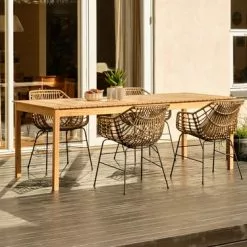 Bord: Massiv FSC® teak. B90 x L210 x H75 cm. Stol: Stål och konstrotting.