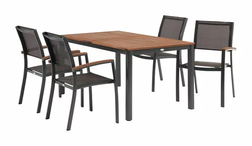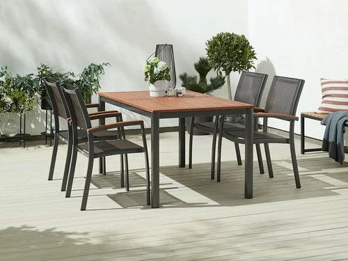 Bord: Aluminium och oljat FSC® hårdträ. B90 x L150 x H75 cm. Stol: Aluminium, textilene och oljat FSC® hårdträ. Stapelbar.