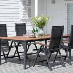 Bord: Aluminium och oljat FSC® hårdträ. Inkl. 1 klaff, som kan förvaras under bordsskivan. B100 x L210/300 x H75 cm. Stol: Aluminium, textilene och oljat FSC® hårdträ. 6 positioner. Hopfällbar.
