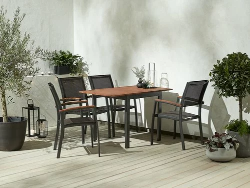 Bord: Aluminium och oljat FSC® hårdträ. Med 1 klaff. B70 x L75/126 x H75 cm. Stol: Aluminium, textilene och oljat FSC® hårdträ. Stapelbar.