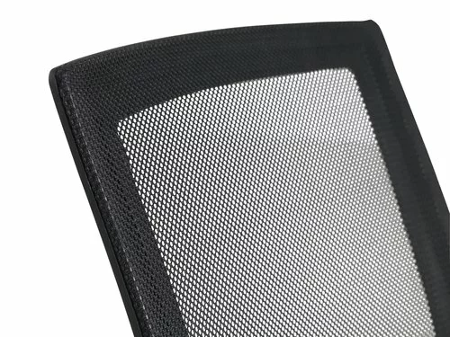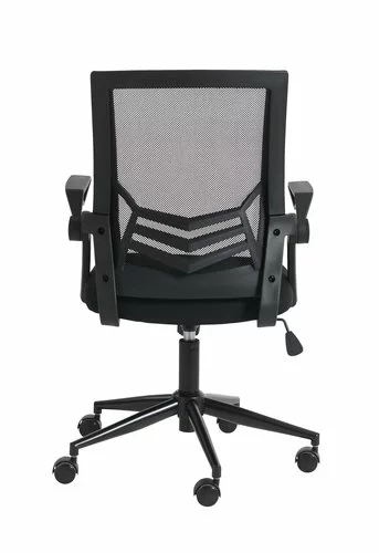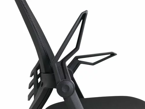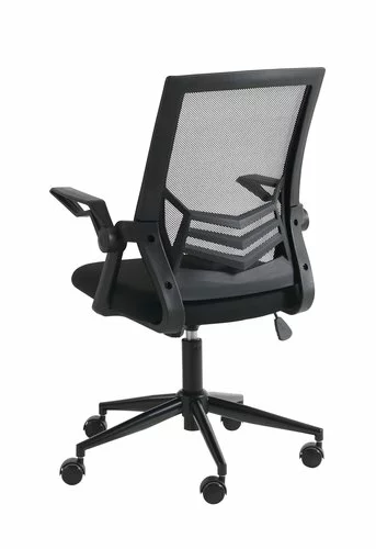 Tyg- och meshklädsel. Bas i metall. Med svankstöd, uppfällbara armstöd, justerbar höjd och steglös lutningsmekanism. B59 x H95-106 x D61 cm