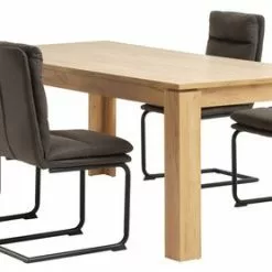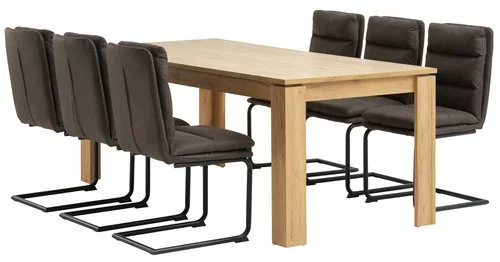 Bord: Konstfanér. Inkl. 2 klaffar, som kan förvaras under bordsskivan. B90 x L190/280 x H77 cm. Stol: Tygklädsel och stål.