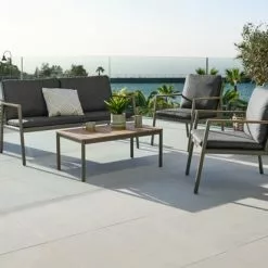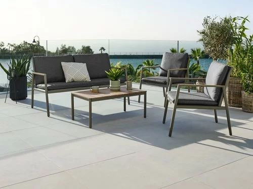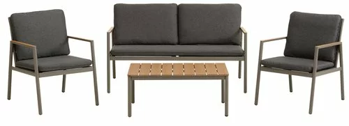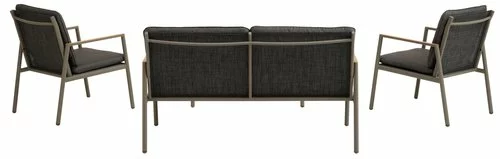 Bord: Stål och konstträ. B55 x L90 x H38 cm. 2-sits soffa och stol: Stål och textilene. Inkl. kvalitetsdynor med slitstarkt överdrag.