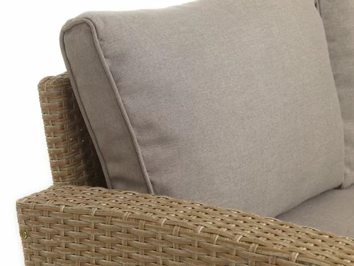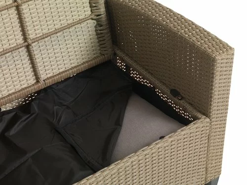 Bord: Stål, konstträ och konstrotting. B74 x L144 x H67 cm. 6-sits soffa: Stål och konstrotting. Med förvaringsutrymme och vattentät förvaringsväska till dynorna. Kan ej spegelvändas. Inkl. exklusiva dynor med slitstarkt, strukturvävt överdrag.