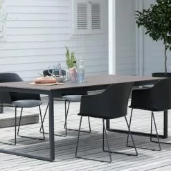 Bord: Aluminium, stål och konstträ. B100 x L210 x H74 cm. Stol: Stål och formgjuten, UV-skyddad plast.