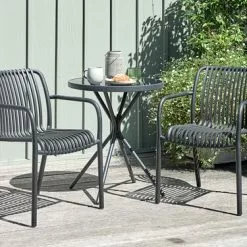 Bord: Stål och härdat glas. Ø60 x H70 cm. Stol: UV-skyddad plast. Stapelbar.