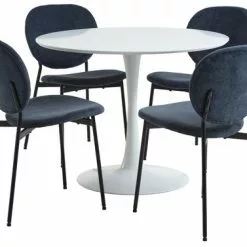 Bord: MDF och stål. Ø100 x H75 cm. Stol: Tygklädsel och stål.
