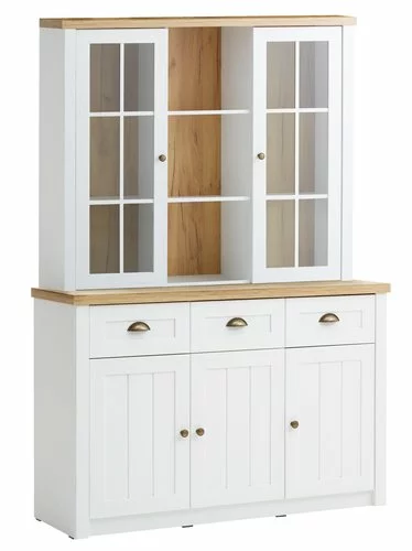 Konstfanér, MDF och härdat glas. Lådor med fullt utdrag. Skänk B132 x H87 x D43 cm Överdel B132 x H111 x D35 cm