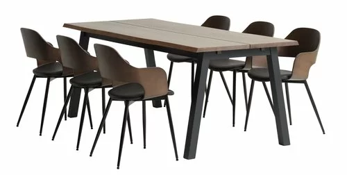 Bord: Massiv ek och ekfanér. Exkl. klaffar. B90 x L200 x H76 cm. Stol: Konstläderklädsel, ekfanér och stål.