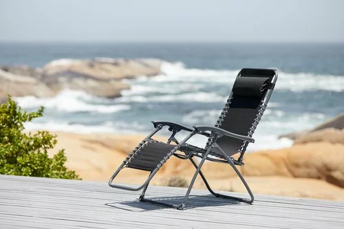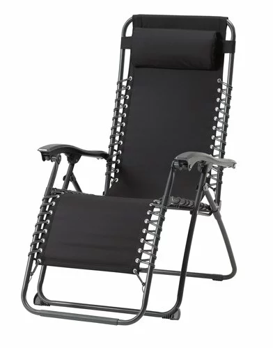 Stål och polyester. Steglös justering av stolsrygg och benstöd. Hopfällbar.