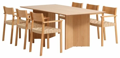 Bord: Massiv ek och ekfanér. B100 x L200 x H75 cm. Stol: Polyesterklädsel, ekfanér och massiv ek.